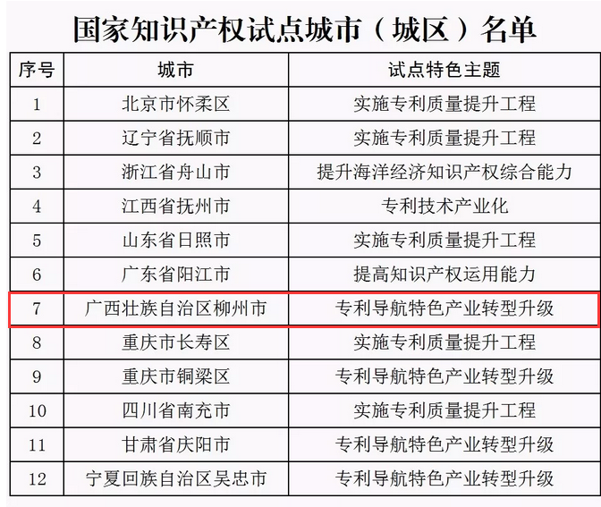 12月22日,根据《国家知识产权试点、示范城市管理办法》(国知发管字[2016]87号)的相关规定,经过广西壮族自治区知识产权局的推荐与国家知识产权局的评审,确定柳州市为国家知识产权试点城市,试点周期为2017年12月至2020年12月。